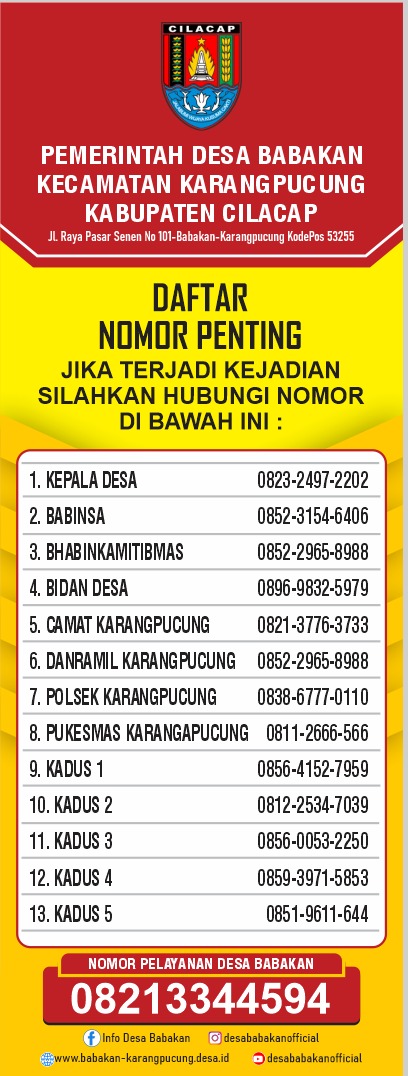 Sebagai bentuk kesiapsiagaan dan pelayanan cepat terhadap berbagai kejadian di lingkungan masyarakat, Pemerintah Desa Babakan menyediakan daftar nomor penting yang dapat dihubungi kapan saja.